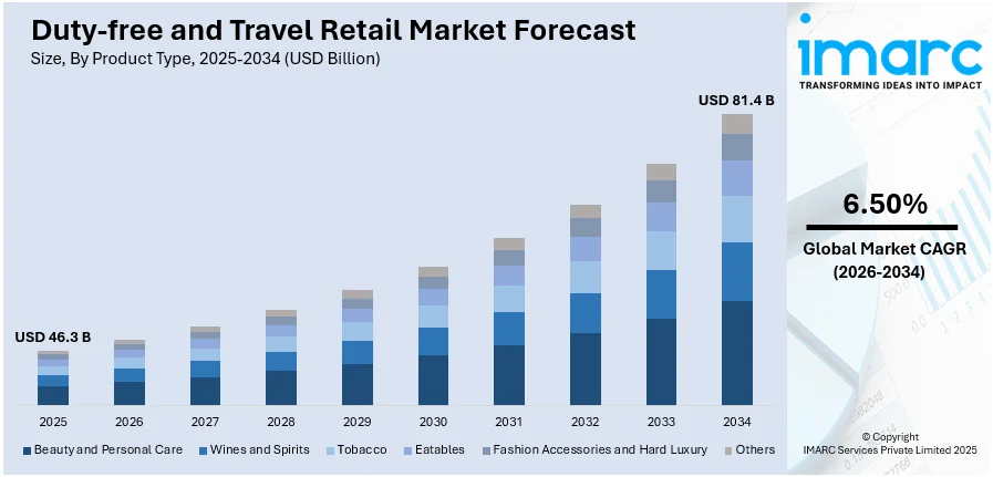 • The global duty-free and travel retail market size was valued at USD 46.3 Billion in 2025, forecasted to reach USD 81.4 Billion by 2034 at a CAGR near 6.5%.