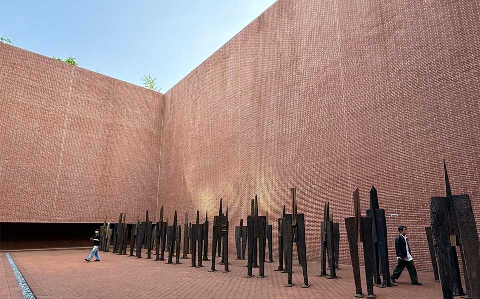 You begin by walking down a curved trail framed by red-brick walls. And this descent is actually intentional; it’s meant to pull you gently away from the noise of the city and into a place of reflection.