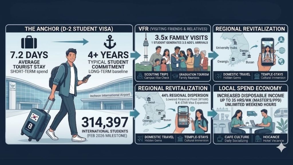 Once enrolled, these students become permanent fixtures in the local economy. In 2026, new labor policies allow Master’s and PhD students to work up to 35 hours per week during semesters, with unlimited hours on weekends. This increased disposable income is being funneled directly into Korea’s leisure economy—from Hocance (hotel vacations) in Busan to cafe-hopping in Gwangju.