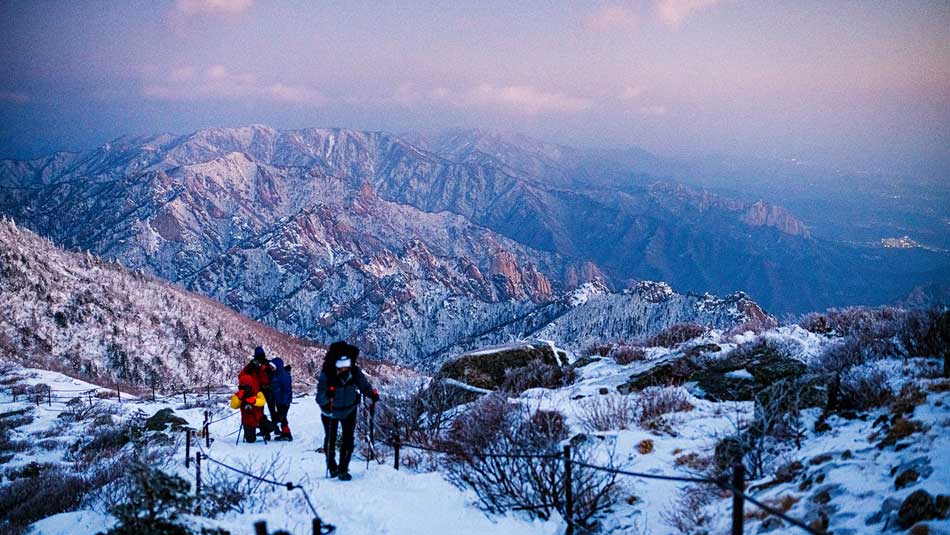 – National Parks: Snow-covered trails in Seoraksan, Hallasan, and Jirisan.